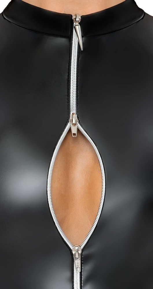 Body altamente elastico di Noir in nero nobile powerwetlook. Taglio aderente con pratica ed erotica cerniera a 3 vie color argento che dal collo alto scende fino al cavallo. I tagli extra alti sulle gambe mettono in risalto il sedere e le gambe in modo eccitante.
